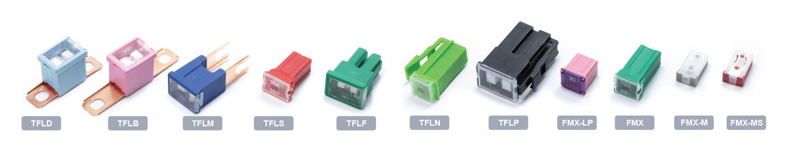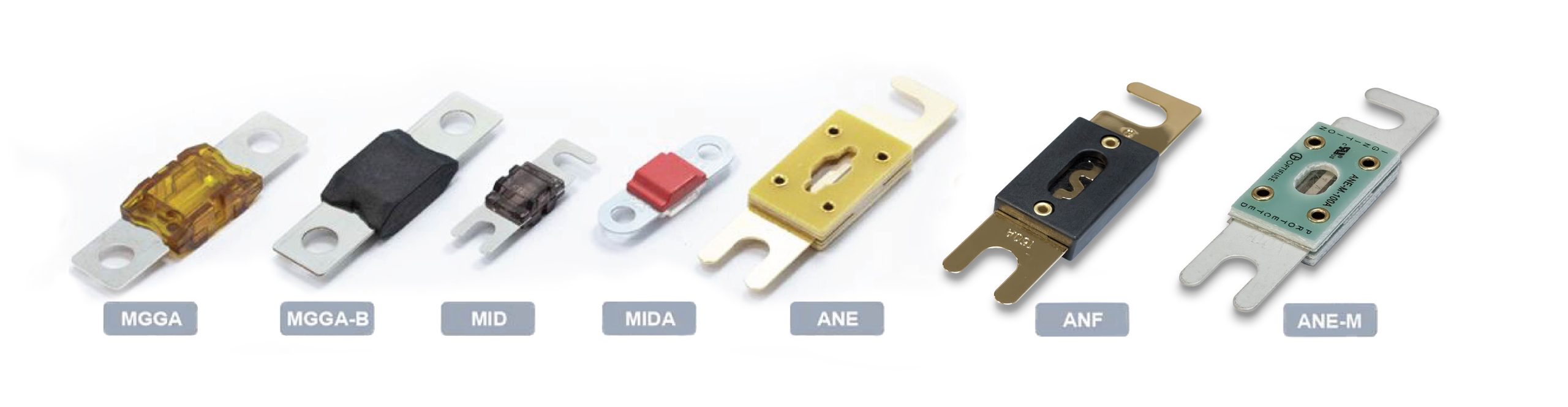 - SFE (FSO): OEM-specific fuses with lengths that increase according to amperage, designed to match manufacturer specifications.